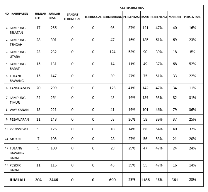 LAMPUNGSTREETNEWS, Bandar Lampung – Indeks Desa Membangun (IDM) 2025 mencatat seluruh desa di Provinsi Lampung telah terbebas dari status tertinggal dan sangat tertinggal. Dari total 2.446 desa di 13 kabupaten, tidak ada lagi desa yang masuk dalam dua kategori tersebut.